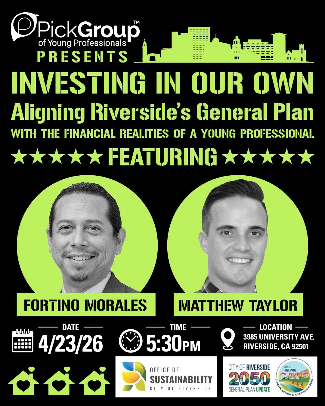 Join the PICK Group’s Civic Committee for an essential conversation on how the City’s long-term vision intersects with the economic realities of being a young professional in 2026. As Riverside updates its General Plan and Climate Action & Adaptation Plan (CAAP) for 2050, the decisions made today will dictate the cost of living and housing availability for decades to come.